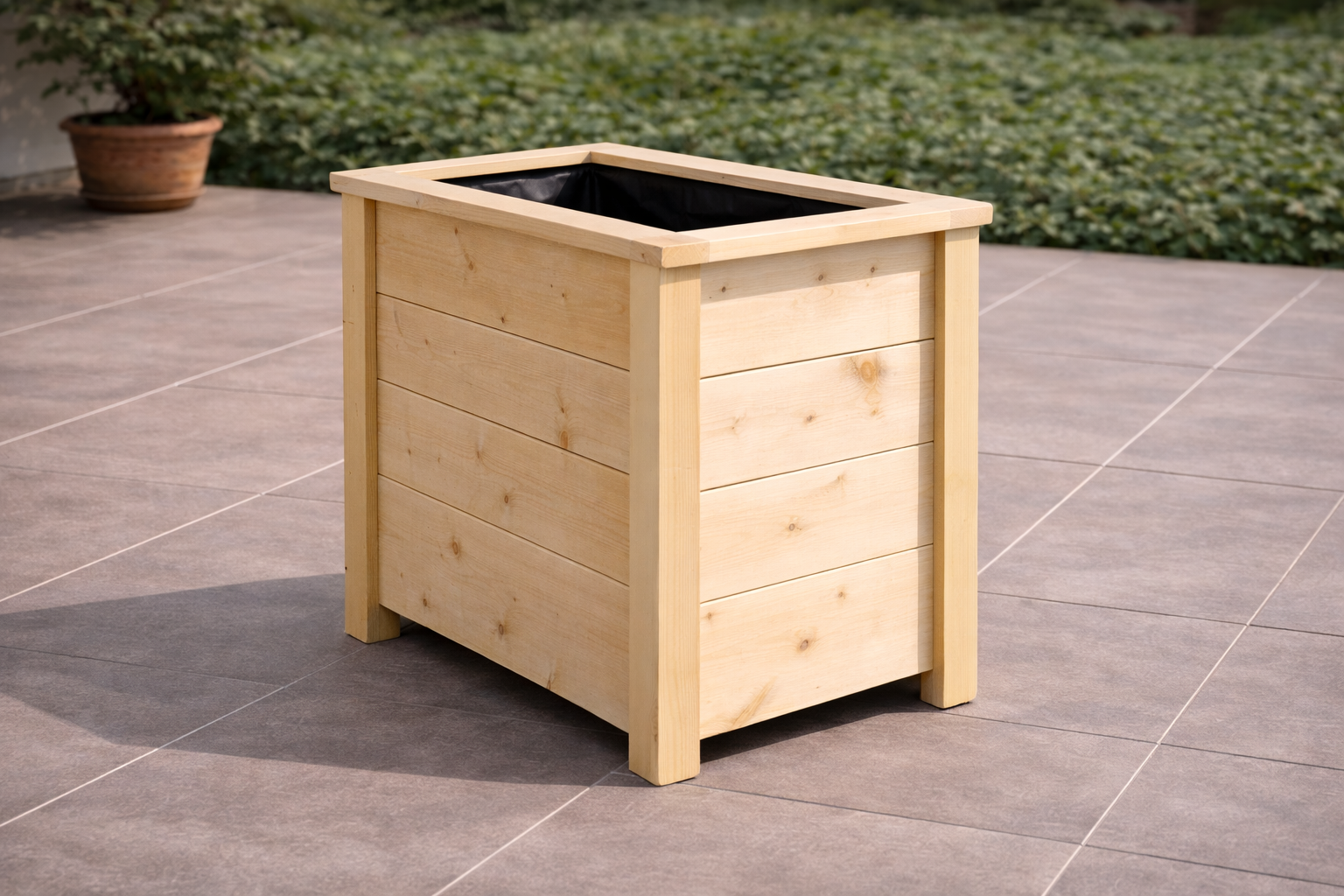 60 × 30 cm-es hajópadlóból készült virágláda, precíz és esztétikus kialakítással. Teraszra, kültérre és beltérre egyaránt alkalmas.